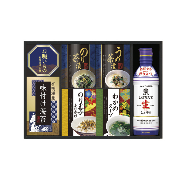 | 内容 | キッコーマンしぼりたて生しょうゆ450ml・永谷園お吸いもの松茸風味(2.3g×2)・有明海産味付け海苔(8切4枚×2)・のり茶漬け(4.3g×2)・うめ茶漬け(4.3g×2)・のり玉子ふりかけ(4.5g×2)・わかめスープ(5.3g×2)×各1 |