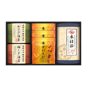 | 内容 | 飛騨高山椿屋監修(わさび海苔・梅しそ海苔)(8切6枚)・天然醸造蔵仕込み卵かけ醤油200ml×各1、国産あごだし茶漬け5g×3 |
