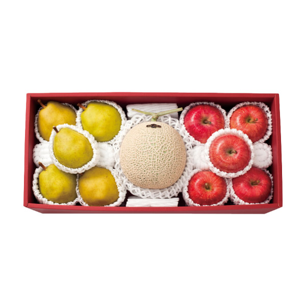 | 原産国 | 温室マスクメロン:宮崎または熊本または長崎県産、ラ・フランス:山形または青森県産、サンふじりんご:青森または長野または岩手県産 |