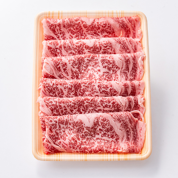 馬刺しと黒毛和牛の専門店「フジチク」オリジナルブランド黒毛和牛「藤彩牛」。阿蘇のミネラル豊富な地下水とオリジナル配合の飼料で育ち、1頭ごとに徹底的に健康管理を行い、手塩にかけて育てています。その肉は赤身とサシのバランスが絶妙で、中でもロース肉はひときわやわらかい肉質と、美しいサシが自慢。熟練の職人が丁寧にスライスした肉を、すき焼きなどでお楽しみください。