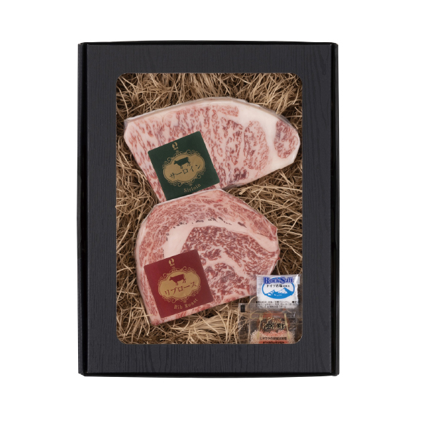 | 内容 | 特選千屋牛サーロインステーキ150g、特選千屋牛リブロースステーキ150g、ピンク岩塩・岩塩 各1g |