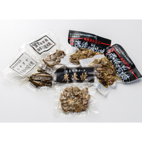 | 内容 | 九州産赤鶏の炭火焼95g×2、福岡県産玄海ポークの炭火焼80g、国産砂肝の炭火焼80g、国産手羽中の炭火焼80g |