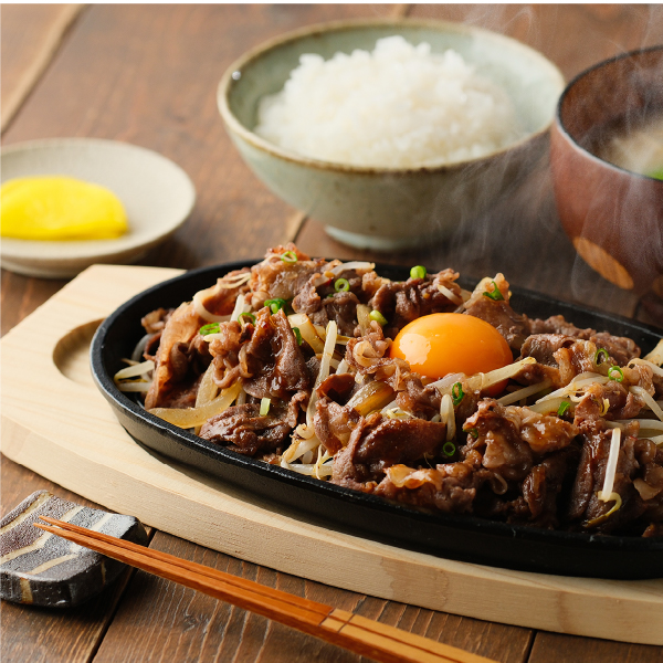 昭和20年創業の赤丸食堂の焼肉定食に使用しているたれを国産肉とセットしました。大阪産(もん)の新生しょうゆをベースに、おろしにんにくと4種の唐辛子が絶妙にブレンドされた甘辛味のたれは白いごはんに最高に合います。たれと絡みやすくうす切りにした牛肉とお好みの野菜を炒めていただければ、お店と同じ味をご家庭でお楽しみいただけます。