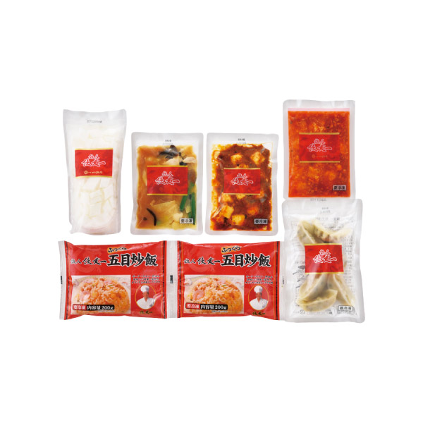 | 内容 | 餃子(6個入)(約120g)・本格四川麻婆豆腐(約150g)・乾焼蝦仁(エビチリソース)(約150g)・本格八宝菜(約150g)・杏仁豆腐(約500g)×各1、ふっくら五目炒飯(約200g)×2 |