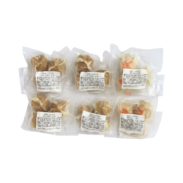 | 内容 | 道産子豚肉しゅうまい(3個入)(約90g)×4、雪の花かに三昧(3個入)(約90g)・雪の花えび三昧(3個入)(約90g)×各1 |
