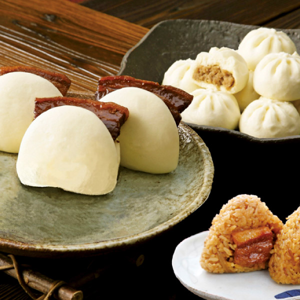 人気のミニ豚まんに角煮を挟んだ角煮まんじゅう、煮汁で味付けおにぎりに角煮をのせた詰合せです。