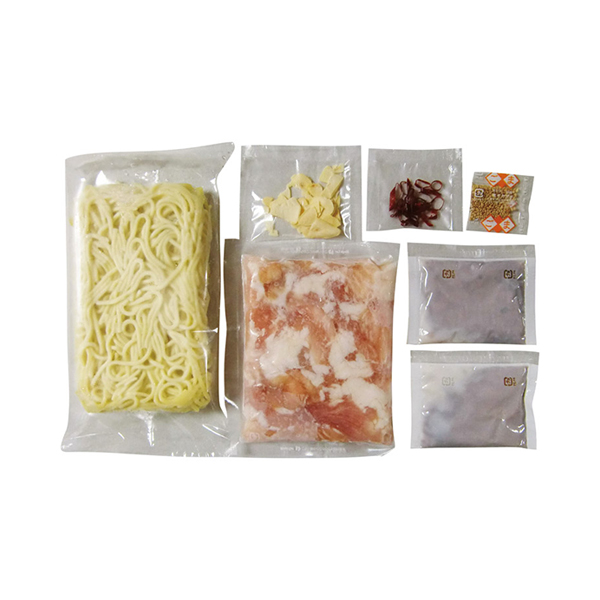 | 内容 | 牛もつ肉(国内産)(100g)・ちゃんぽん麺(180g)・にんにく(3g)・唐辛子(0.5g)・白ごま(0.7g)×各1、もつ鍋用濃縮とんこつスープ(36g)×2 |