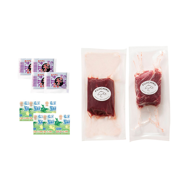 | 内容 | ふじ馬刺し上赤身(80g)・ふじ馬刺し中トロ(80g)×各1、馬刺し用たれ(5ml)・生姜小袋(3g)×各4 |