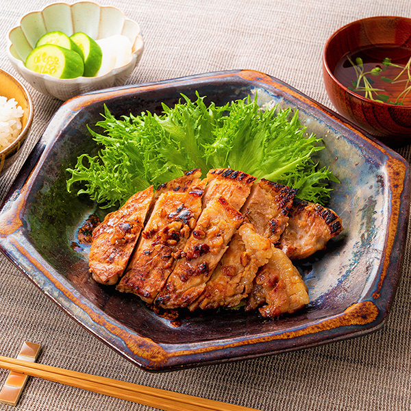 岡山県産SPF豚ピーチポークとんトン豚のロースを使用。♂デュロック×♀交配種(♂大ヨークシャー×♀ランドレース)の三元交配種で、きめが細かく非常にやわらかい肉質、保水性が高く、赤身に適度な脂肪がありジューシーな豚肉です。そんなピーチポークを味噌漬けにしました。味噌にもこだわり、岡山の老舗味噌蔵「備前味噌」が造る、国産裸麦を原料にした岡山県産「金山寺味噌」を使用。甘味とコク、そして香りが引き立つ逸品です。調理レシピ付き。