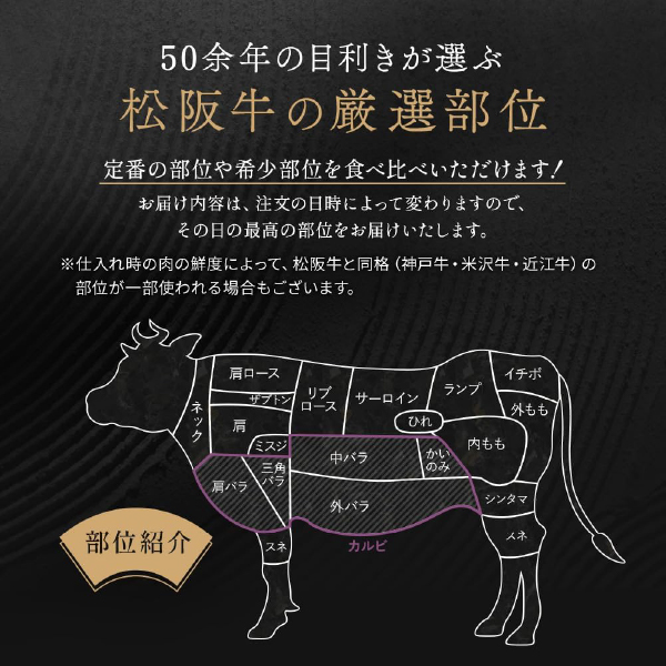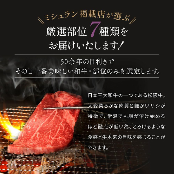 | 内容 | 松阪牛焼肉用厳選部位7種(計800g) |