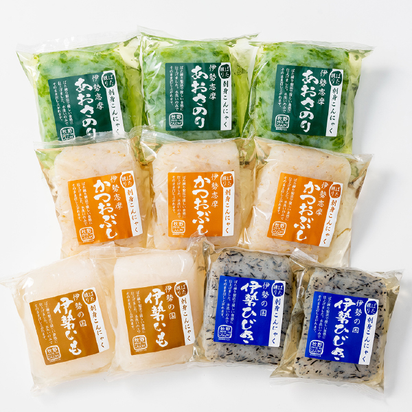 伊勢志摩地方の特産であるあおさのりをはじめ、ひじき・かつおぶし・伊勢いもをそのまま使用した素材感たっぷりのヘルシーな刺身こんにゃくです。からし酢みそなどでそのまま召しあがれます。
