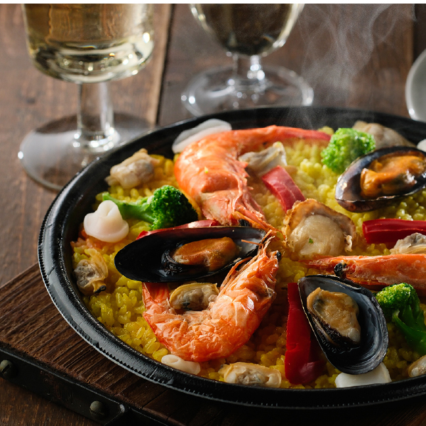 サフランライスの上に、殻ごと食べられる海老(ソフトシェルシュリンプ)、ほたて、いか、あさり、ムール貝、ブロッコリー、パプリカを丁寧にトッピング。電子レンジで加熱するだけで、食べやすさ・おいしさ・見ためが揃ったパエリアがお楽しみいただけます。
