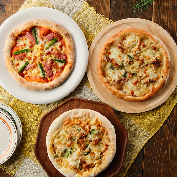 淡路島の食材・えびすもち豚にこだわった冷凍ピザで、生地はフランスパンベースで歯ごたえのあるもっちり系。淡路島特産の玉ねぎとの相性も抜群で、3枚それぞれ特色のある味をお楽しみいただけます。