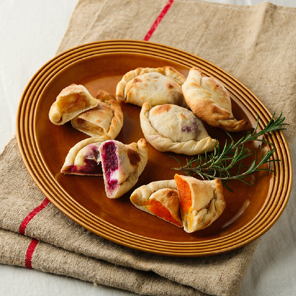 徳島を代表する鳴門金時をはじめ、色鮮やかな紫芋や濃厚な味わいの人参などの素材の持ち味を活かし、やさしい甘さのチーズクリームを加えて手包みで仕上げたカルツォーネピザ。300℃で一気に焼きあげて旨みを凝縮し、おいしさをそのままに−35℃で瞬間冷凍するため、電子レンジで温めるだけで作りたての味わいを楽しめる。