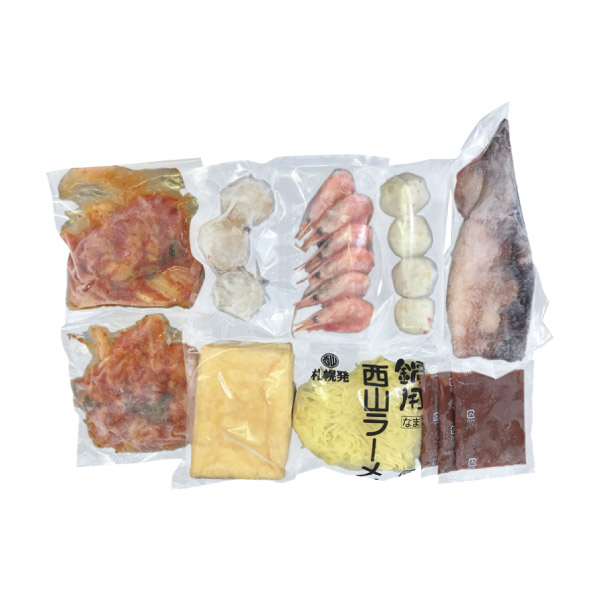 | 内容 | 白菜キムチ(約100g)・油揚げ(約10g)×各2、ボイル海老(約6g)×6、ボイル帆立(約20g)・たれ(濃縮:キムチ仕立て)(約30g)×各3、えび入つみれ(約20g)×4、ツボ抜きいか(約100g)・冷凍生ラーメン(約80g)×各1 |