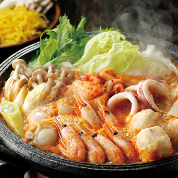 多彩な海鮮素材を本場韓国のピリ辛キムチを添えてお召し上がりください。季節を問わずにお楽しみいただける辛口の海鮮鍋です。