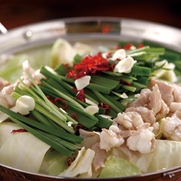 博多を代表する名物のコラボ、とんこつ味のもつ鍋。牛もつはもちろん国内産を使用。キャベツ、ニラなどたっぷり入れて食べたあとの『しめ』のちゃんぽんが格別です。