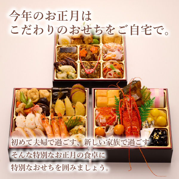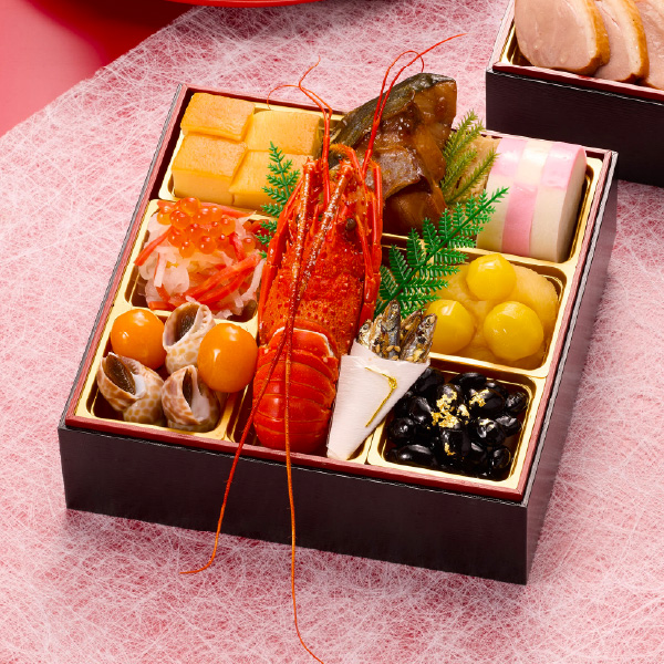 お節の定番献立とロブスターを1尾盛り込んだ、お得で華やかな三段重お節です。特に、江口大将こだわりの逸品、ちりめん山椒をご賞味ください。