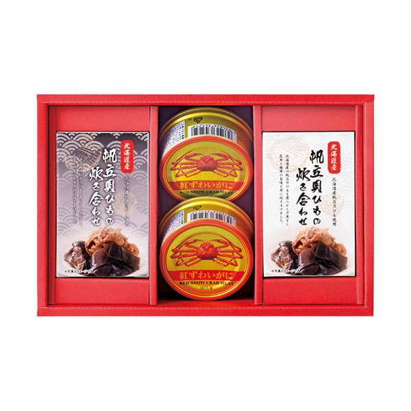 紅ずわいがに缶と帆立貝ひも炊き合わせを詰めたセット。どんな料理とも相性抜群で、使い勝手の良いかに缶はストックもでき大変便利です。風味豊かな海の幸を手軽に楽しめる、心温まる贅沢なギフトです。