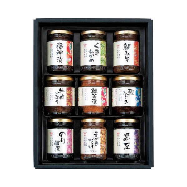| 内容 | 福神漬(90g)・くきわかめ(75g)・のり佃煮(95g)・鮭茶漬(60g)・鯛みそ(100g)・黒豆(100g)・えのきだけ(90g)・牛肉ごぼう(55g)・鰹ひじき(40g)×各1 |