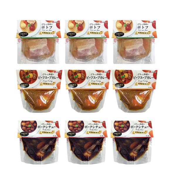| 内容 | ポトフ290g×3、カレー245g×3、シチュー245g×3 |
