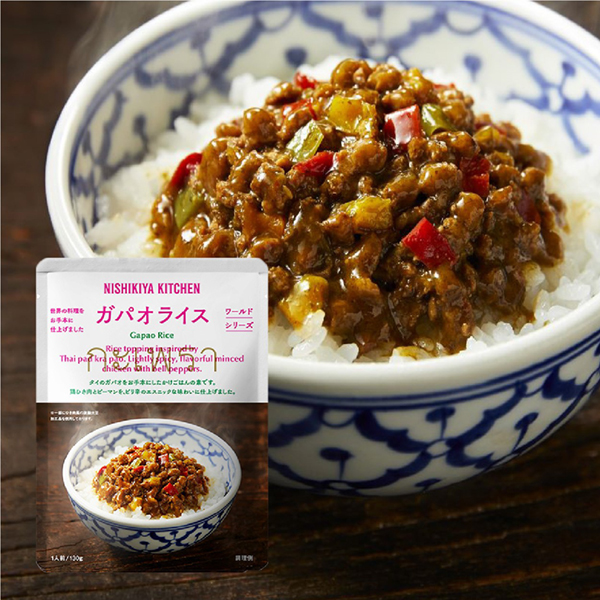 タイ料理のガパオをお手本にしました。炒めた鶏ひき肉とピーマンをバジルと魚醤で風味豊かに味付けし、ピリ辛のエスニックな味わいに仕上げました。