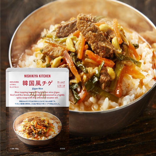 韓国のみそチゲをお手本にしました。コチュジャンと赤唐辛子、ごま油でみそのコクが引き立つ味に仕上げています。牛肉と5種類の野菜が入った具だくさんで食べ応えのあるかけごはんの素です。