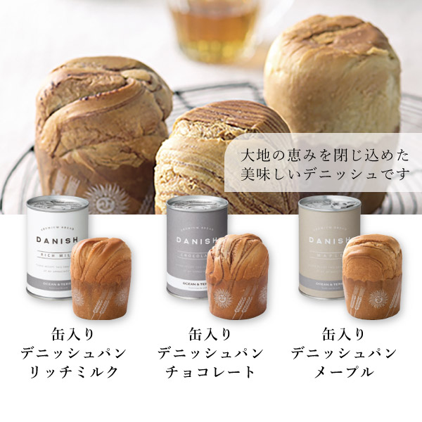 | 内容 | 缶入りデニッシュパン リッチミルク80g×1、缶入りデニッシュパン チョコレート80g×1、缶入りデニッシュパン メープル80g×1 |