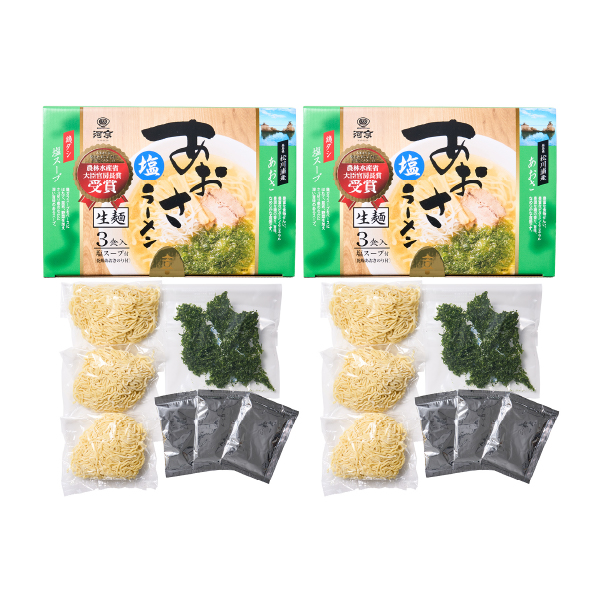 | 内容 | 3食入(生麺120g・塩スープ50g×各3袋、乾燥あおさのり6g×1袋)×2箱 |