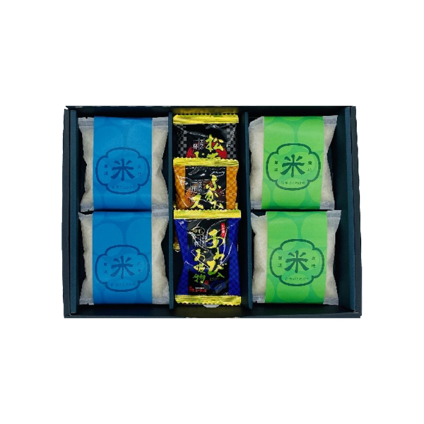 | 内容 | 新潟県産コシヒカリ150g(1合)×2、新潟県産こしいぶき150g(1合)×2、松茸のお吸物4.2g×1、ふかひれスープ5.5g×1、あわび入お吸物4g×1 |