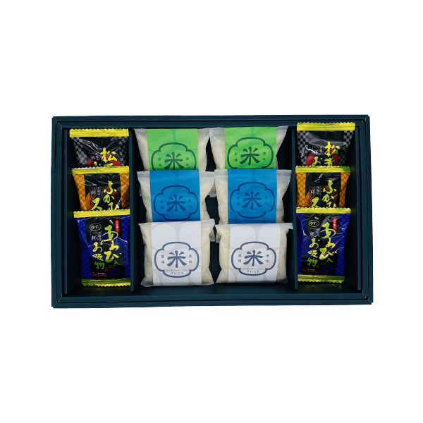 | 内容 | 新潟県産コシヒカリ150g(1合)×2、新潟県産こしいぶき150g(1合)×2、五つ星マイスターブレンド米150g(1合)×2、松茸のお吸物4.2g×2、ふかひれスープ5.5g×2、あわび入お吸物4g×2 |