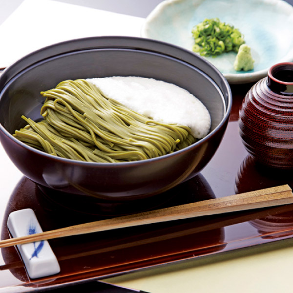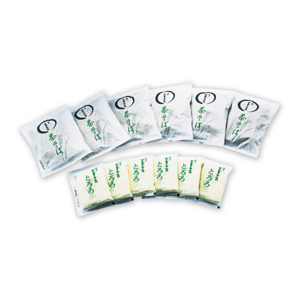 静岡県産抹茶とやまいもを入れじっくり乾燥させた「茶そば」とからみやすいよう大和芋と長芋を混ぜ合わせた専用の「とろろ」のセットにしました。