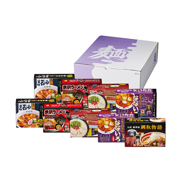 | 内容 | 喜多方ラーメン「まるや」醤油味(2食入)(220g)・米沢ラーメン「三男坊」味噌味(2食入)(268g)・博多ラーメン「いっちょいっちょ」豚骨味(2食入)(230g)・飛騨高山中華そば「なないろ」(2食入)(250g)×各2、北海道札幌ラーメン「綱取物語」味噌味(2食入)(288g)×1 |