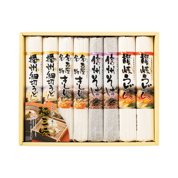 | 内容 | 讃岐うどん(180g)・信州そば(120g)・名古屋名物きしめん(150g)・播州細切りうどん(150g)×各2 |
