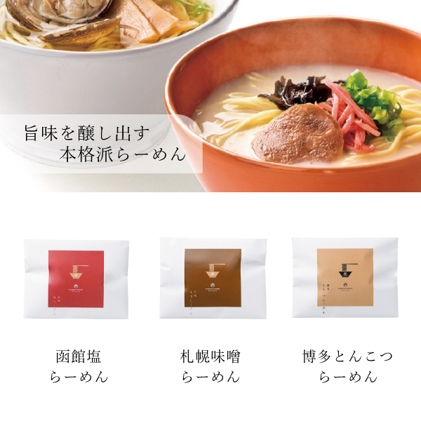 日本各地の美味しいラーメンを贅沢にセットにしました。「函館塩らーめん」「札幌みそらーめん」「博多とんこつらーめん 」旨味を醸し出す、本格派らーめんです。美味しいひと時を大切な人へ。