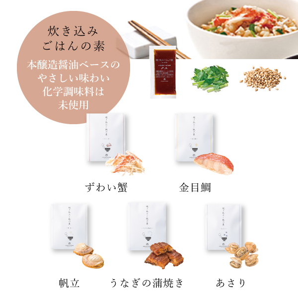 | 内容 | 炊き込みご飯の素38g(2合用)×5、ずわい蟹13g×1、金目鯛1切×1、帆立2個×1、うなぎの蒲焼き13g×1、あさり30g×1、三つ葉0.2g×5、白煎りごま1g×5、お吸い物の素2.9g×5、はまぐり2個×1、ずわい蟹13g×1、紀州南高梅1粒×1、あさり30g×1、宍道湖しじみ30g×1、白煎りごま1g×5 |