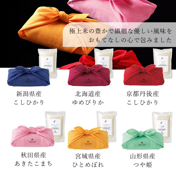 全国のブランド米を食べ比べできる、贅沢なお米のセット。日本人の体に深く染み渡る瑞穂の恵みの豊かで繊細な優しい風味を、おもてなしの心で包みました。「新潟産 こしひかり」「北海道産 ゆめぴりか」「京都丹後産 こしひかり」「秋田産 あきたこまち」「宮城産 ひとめぼれ」「山形産 つや姫」大切に作られた、風土の豊さを感じる味を食べ比べてみてください。美しい風呂敷で包まれた美味しいお米は格調高く、目上の方への贈り物にもおすすめです。