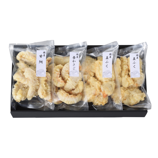 | 内容 | 真ふく天ぷら125g×2、甘鯛天ぷら・夢かさご天ぷら 各125g×1 |