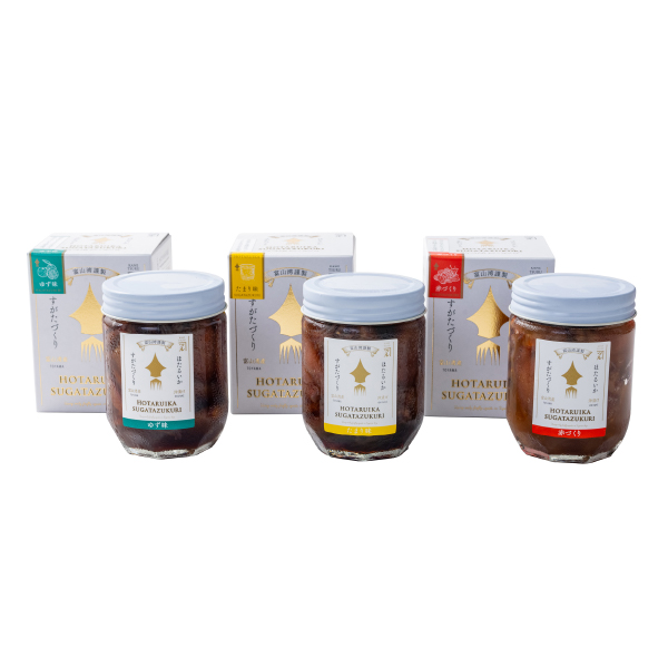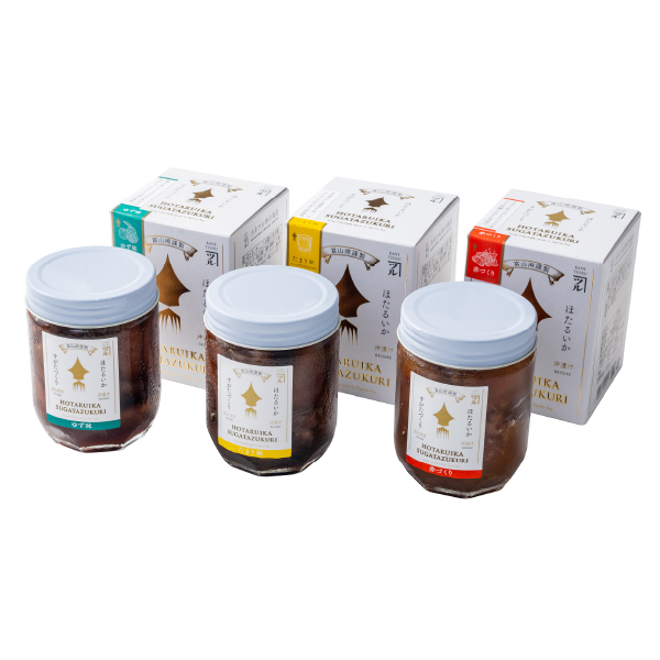 富山湾の春の使者、ほたるいか。ほたるいかのすがたはそのままに1匹ずつ丁寧に目玉を取り、醤油に漬けこみました。ワタのコクが楽しめる「赤づくり」、定番和風の「たまり味」、さわやかな香りの「ゆず味」、沖漬け人気トップ3が一度に味わえるお得なセットです。