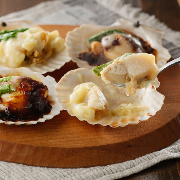 貝の直径10cm前後の北海道産片貝帆立を使用し、ホワイトソースのグラタン仕立てと、デミグラスソースとチーズを乗せて焼いたデミグラスチーズ焼きにしました。どちらも電子レンジで温めるだけの簡単調理でいただけます。
