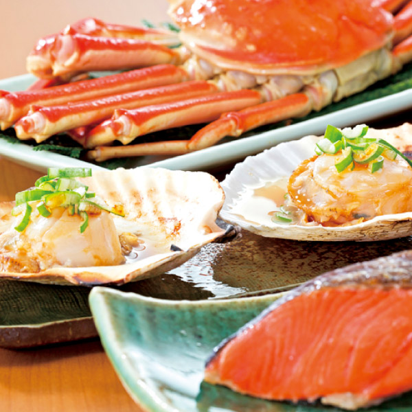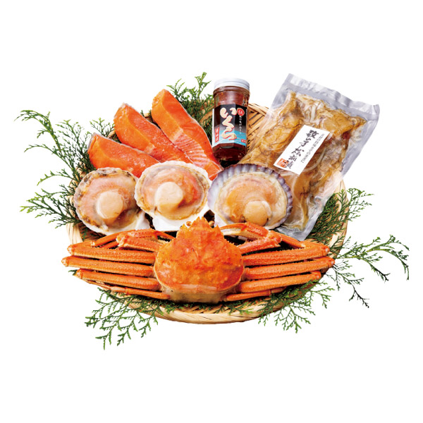 | 内容 | ずわいがに(北海道、カナダ、ロシア産)(約350g)・松前漬け(約200g)・いくら醤油漬け(約60g)×各1、紅鮭切り身・ほたて片貝×各3 |