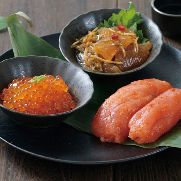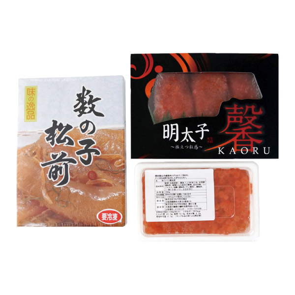 | 内容 | いくら醤油漬け(約100g)・数の子松前漬け(約200g)・辛子明太子(約250g)×各1 |