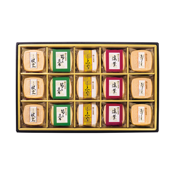 | 内容 | 帆立(12g)・筍と昆布(12g)・ふぐ(12g)・湯葉(12g)・おすまし(12g)×各3 |
