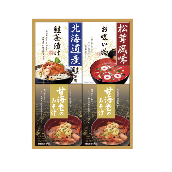 | 内容 | 甘海老みそ汁(7.5g×3)×2、北海道産鮭茶漬け(4g×3)・永谷園松茸風味お吸い物(2.3g×4)×各1 |