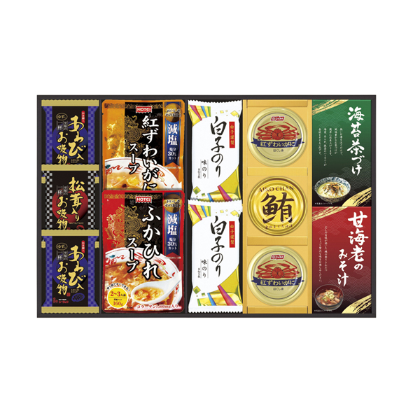 | 内容 | ふかひれスープ160g・紅ずわいがにスープ160g・鮪油漬フレーク70g・松茸入りお吸い物4.2g・甘海老みそ汁(7.5g×2)・丸美屋のり茶漬け(6g×4)×各1、紅ずわいがにほぐし身55g・あわび入お吸い物4g・白子のり(8切5枚)×各2 |