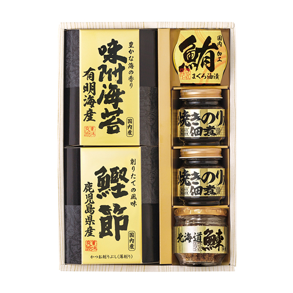 | 内容 | 北海道産鰊フレーク50g・鹿児島県産鰹節(2g×3)・有明海産味附海苔(8切10枚)・まぐろ油漬け70g×各1、焼きのり佃煮85g×2 |