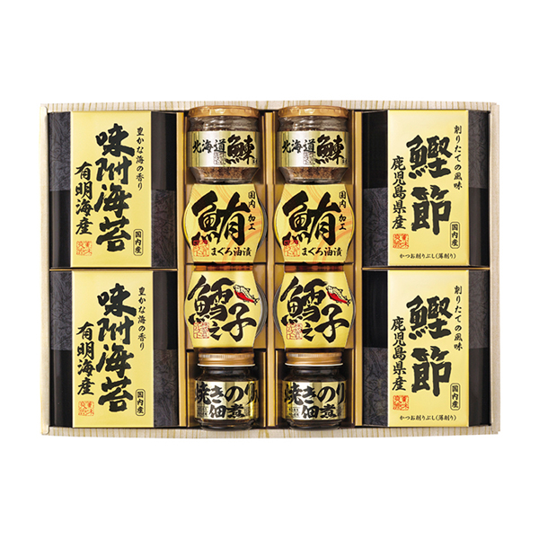 | 内容 | 北海道産鰊フレーク50g・焼きのり佃煮85g・鹿児島県産鰹節(2g×3)・有明海産味附海苔(8切10枚)・まぐろ油漬け70g・鱈之子味付け70g×各2 |