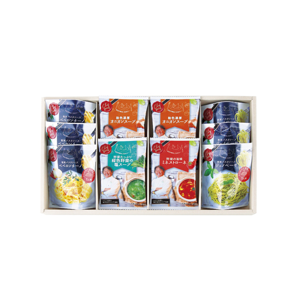 | 内容 | オニオンスープ×2、ミネストローネ・緑色野菜の塩スープ×各1、粉末パスタソース(ジェノベーゼ・ペペロンチーノ)×各3 |