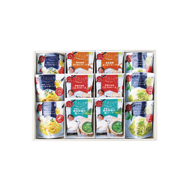 | 内容 | オニオンスープ・ミネストローネ・緑色野菜の塩スープ×各2、粉末パスタソース(ジェノベーゼ・ペペロンチーノ)×各3 |