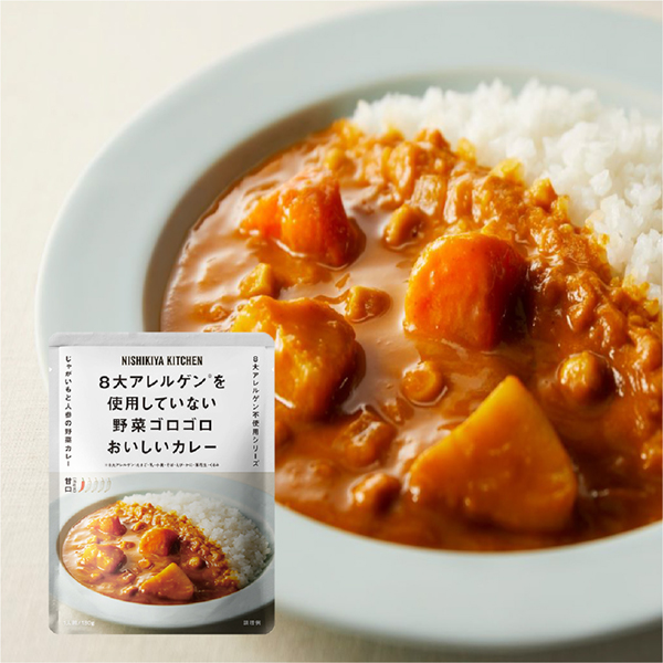 カレーはお肉や野菜の旨み、だしなどを上手に使った減塩商品と、8大アレルゲン不使用で作りました。